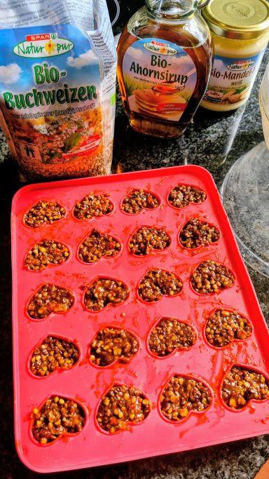 150g Dinkelmehl, 50gMandeln und 50g Walnüssse gerieben, 120g Dattelmus,