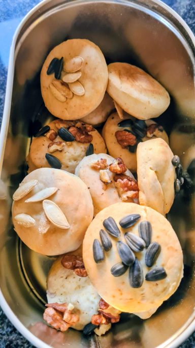 Sesam, Mohn, Sonnenblumenkerne, Kürbiskerne – oder alles, was du zuhause hast!